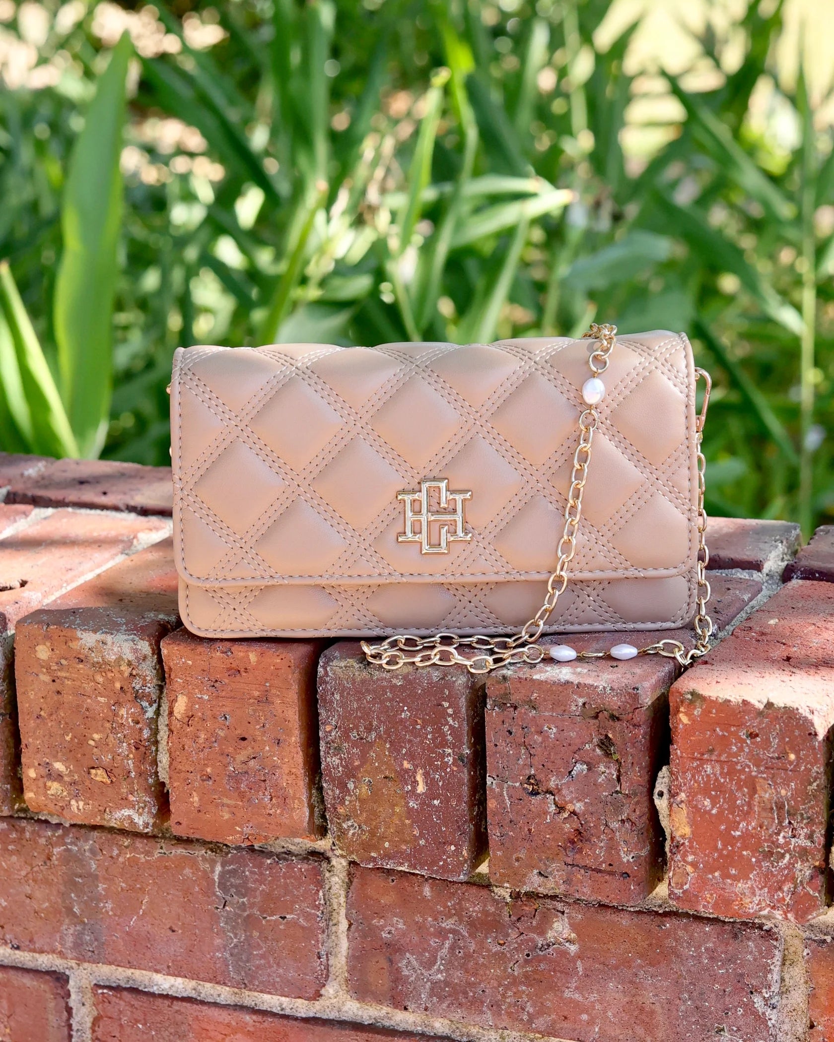 This stylish textured vegan leather handbag is a great statement piece. It has a gold link crossbody strap featuring subtle accent pearls for a classy touch. The strap is removable so the bag can be carried as a fashionable clutch as well. It has a front magnetic flap that features the Caroline Hill logo, and the vegan leather interior has two separate sections with card slots to keep you organized when using!