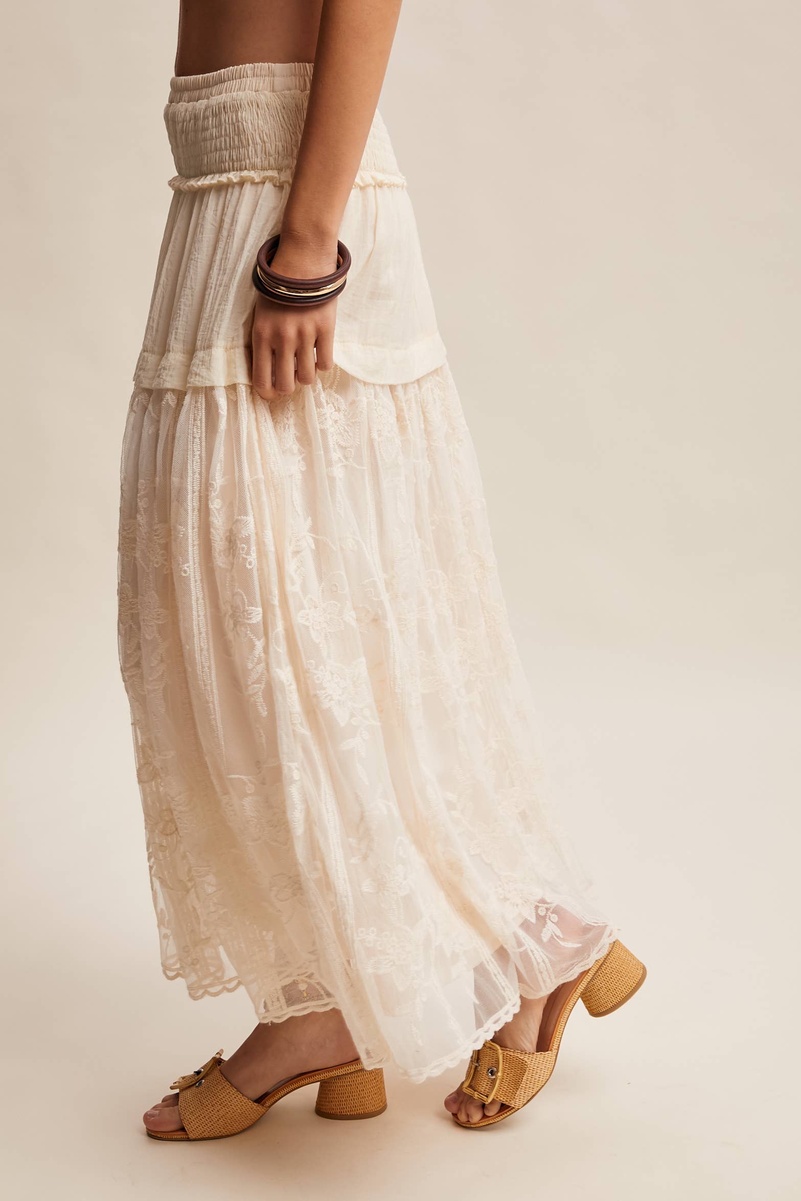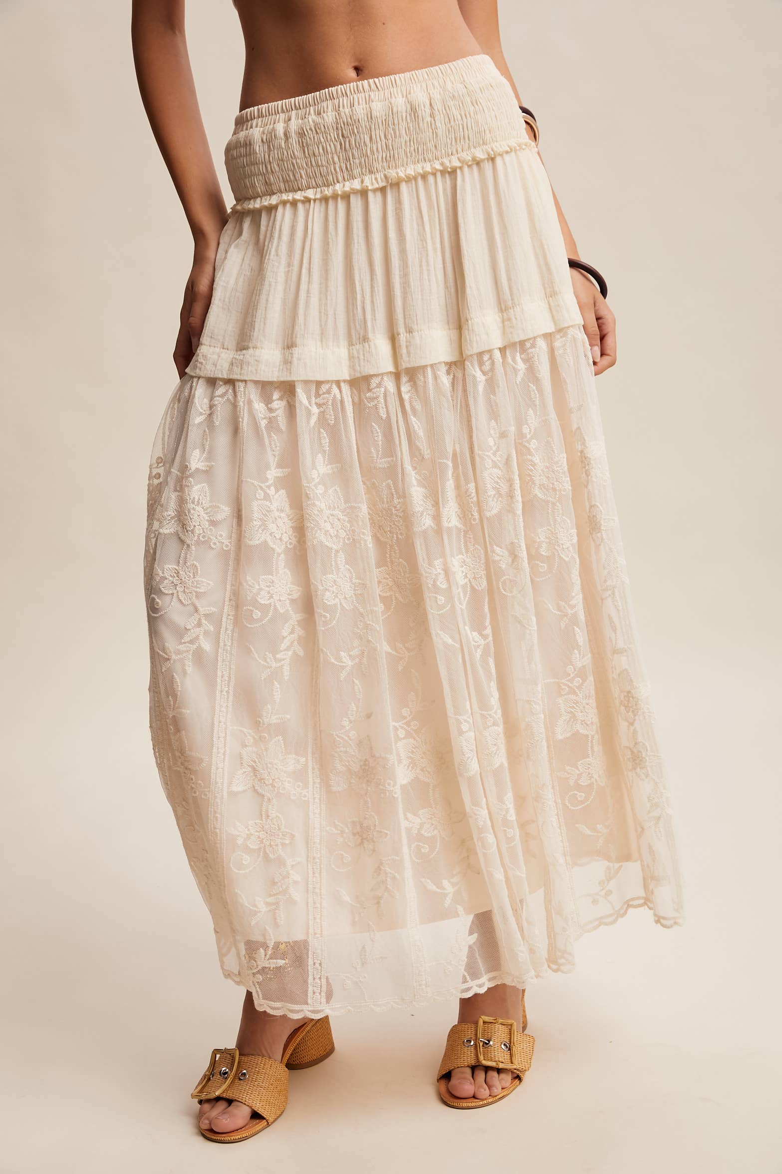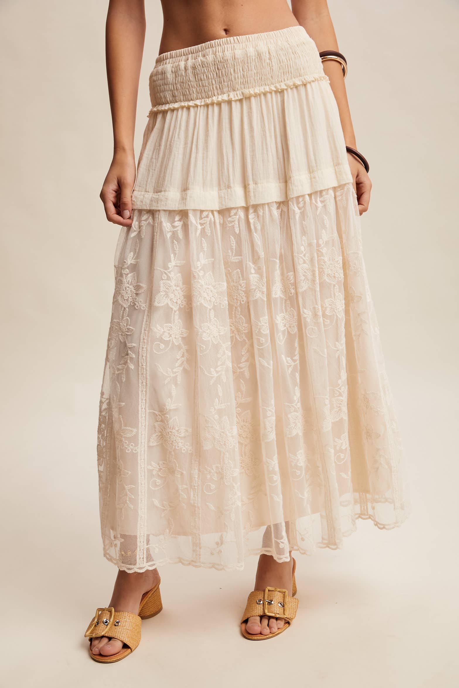 Step into romantic, carefree style with this charming maxi skirt. The soft woven bodice flows into an embroidered mesh skirt adorned with delicate florals, creating that dreamy boho-chic vibe you've been craving. An elasticized smocked waistband hugs you just right, while the tiered silhouette and scalloped hem add movement and whimsy. Fully lined for comfort and coverage, this versatile piece pairs beautifully with anything from lightweight tees to Western-inspired accessories—your new favorite for warm days and effortless elegance.
