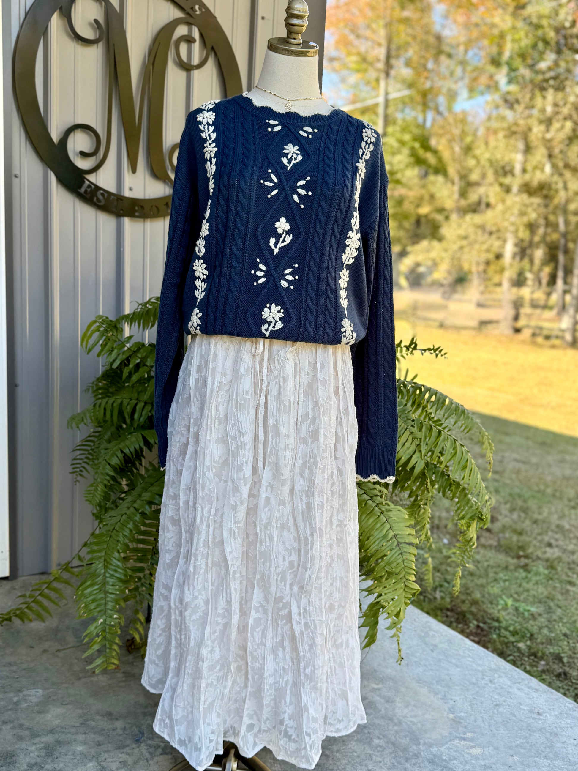 This vintage-inspired maxi skirt showcases a delicate burnout floral fabric with semi-sheer detailing that evokes timeless romance. The relaxed A-line silhouette moves gracefully with every step, while the ruffled waistband introduces a refined feminine accent. An elastic waist paired with an adjustable drawstring delivers customizable comfort, and hidden side pockets provide practical functionality. The full lining ensures discreet, confident wear throughout the day. Perfect for those seeking understated bohemian elegance, this piece transitions seamlessly from casual outings to curated vintage-inspired ensembles.