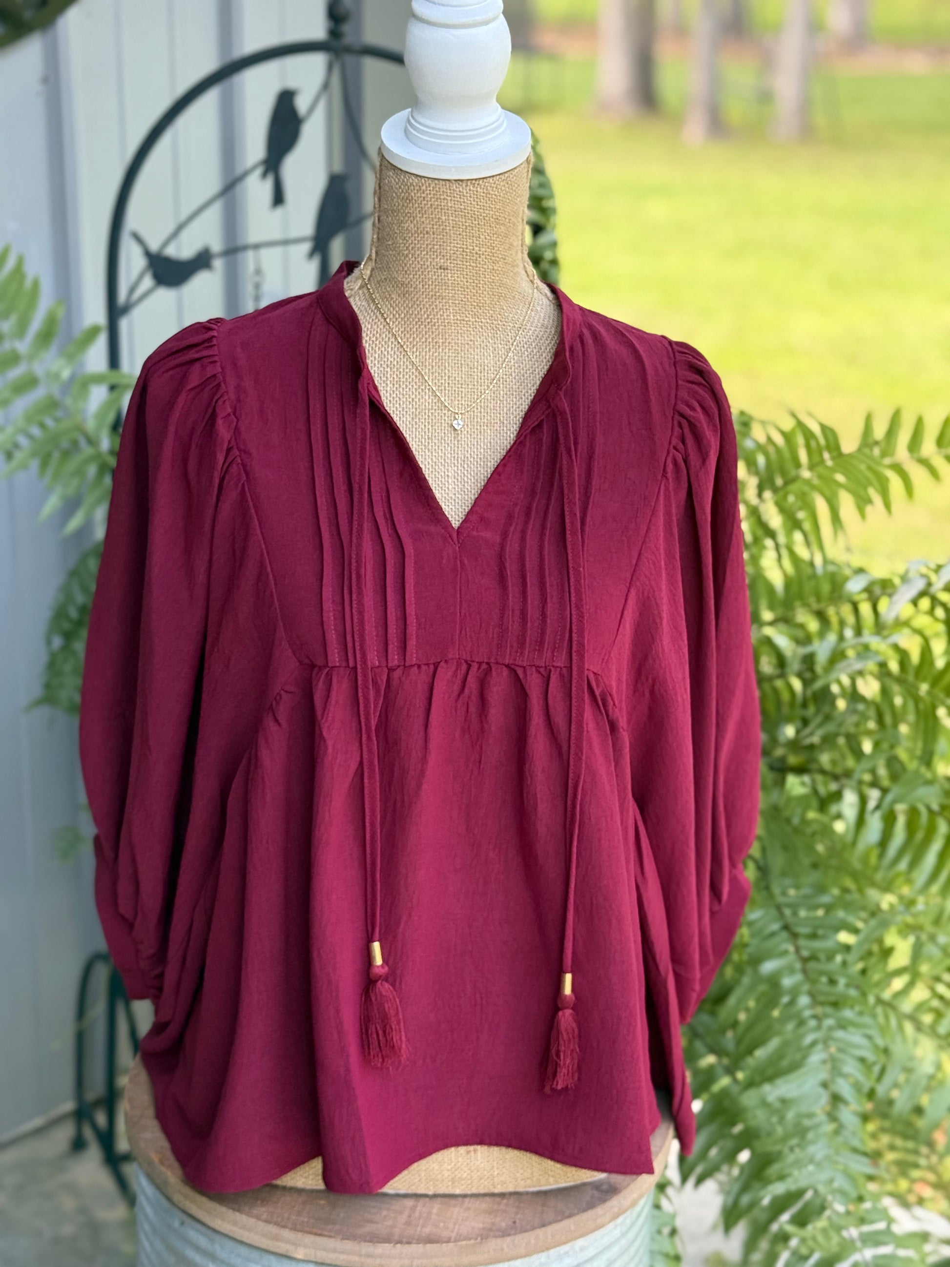 The Lindsey flowy blouse showcases delicate pin tuck accents, billowy sleeves, and a tie-front split neckline. It measures 24" in length and is crafted from 100% polyester for a lightweight feel.