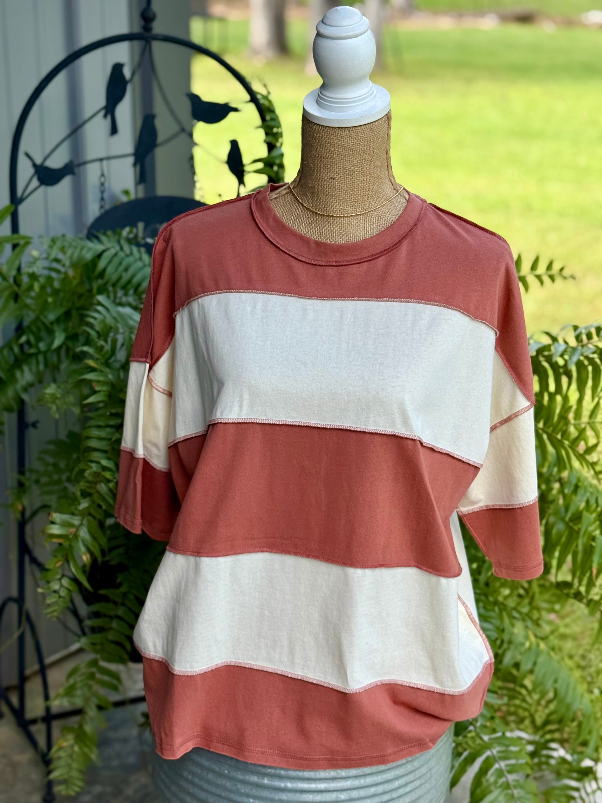 This relaxed-fit T-shirt features bold navy and cream stripes with exposed seams for a casual, effortless vibe. Its oversized silhouette and breezy style make it perfect for pairing with denim shorts or leggings.