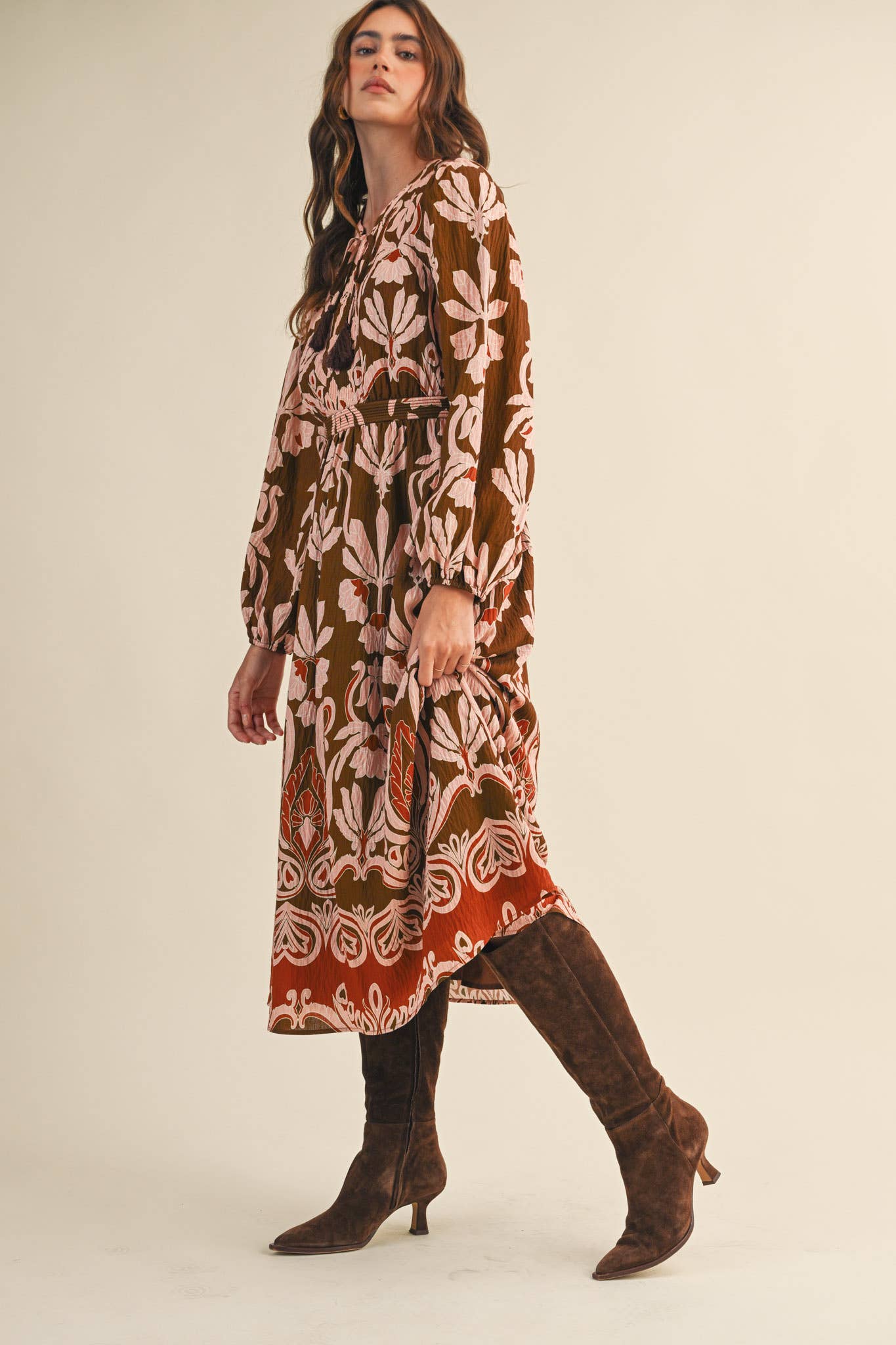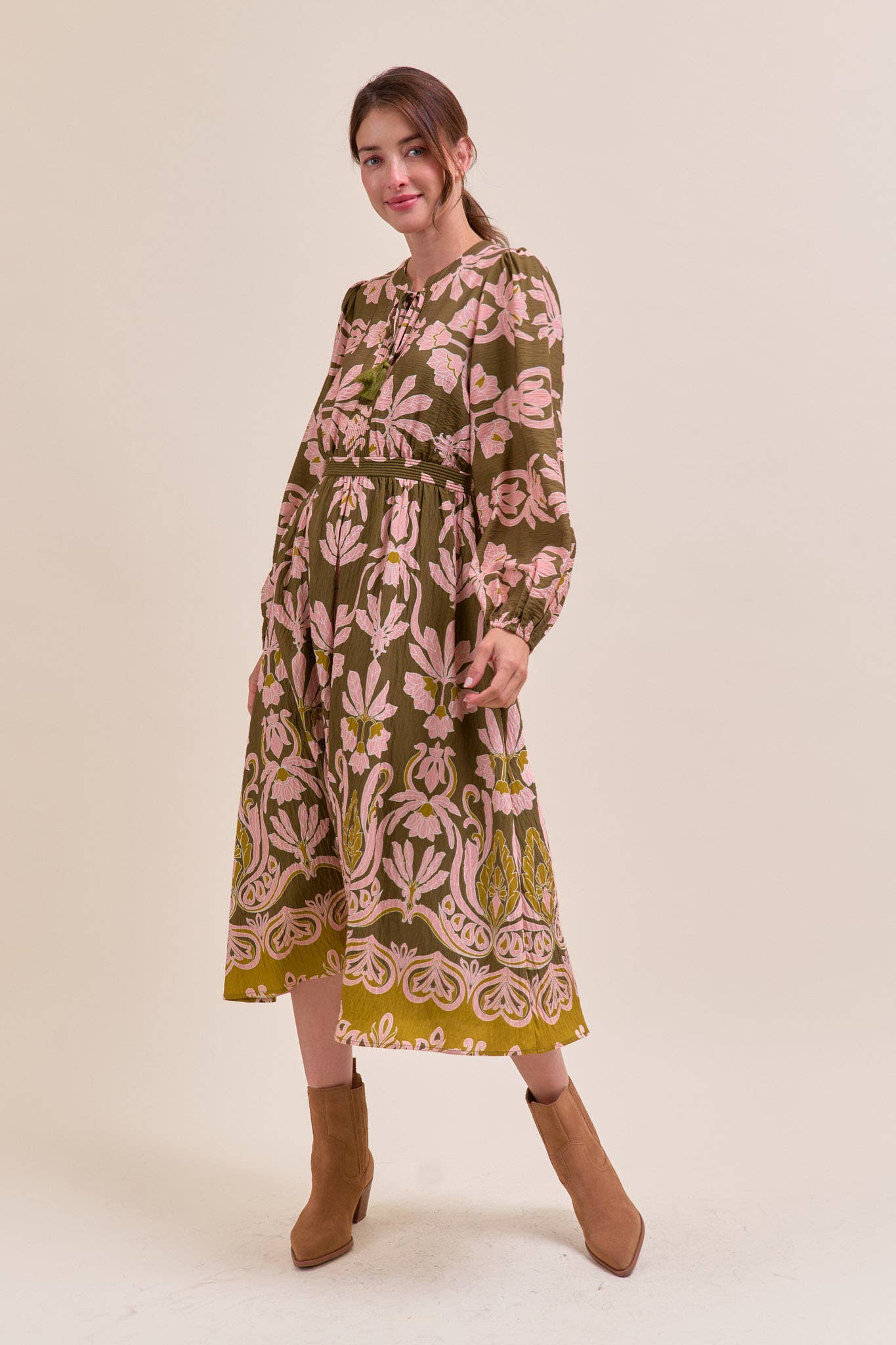 Twirl into spring with the Sally Floral Print Midi—a dress that's as fun as it is fabulous. This charming midi features a romantic floral print paired with a unique round neckline accented by a notched V and playful tying tassels. Delicate piping traces the neckline and waist for added polish, while voluminous puff sleeves with elastic cuffs bring that dreamy, feminine vibe. The gathered puff shoulders and smocked elastic back create beautiful dimension, and a full lining keeps you comfortable all day long.