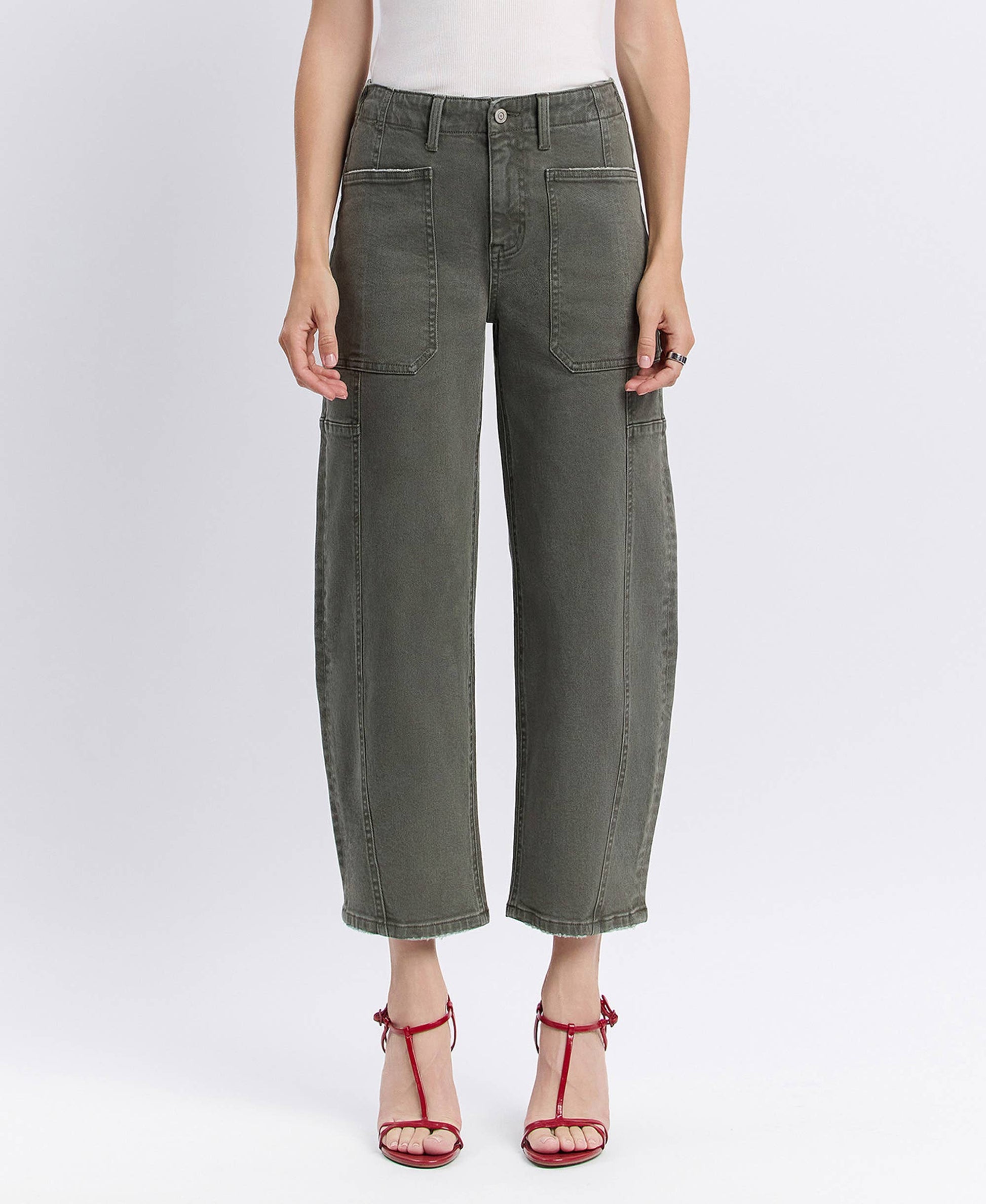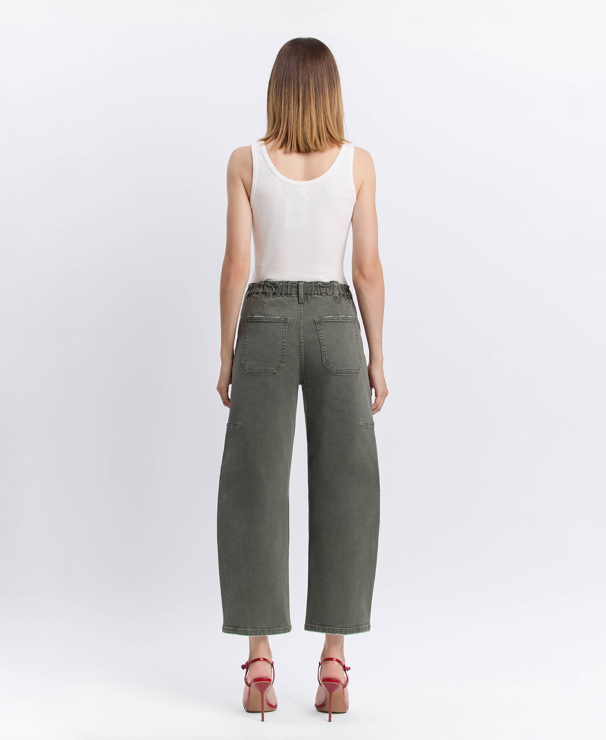 These barrel jeans feature an ultra high-rise waist and an elastic waistband for enhanced comfort. Crafted from stretch denim, they offer a finished hem and cropped length for a modern silhouette. Key measurements include an 11" front rise, 26.5" inseam, and a 17" leg opening, combining style with expert fit.
